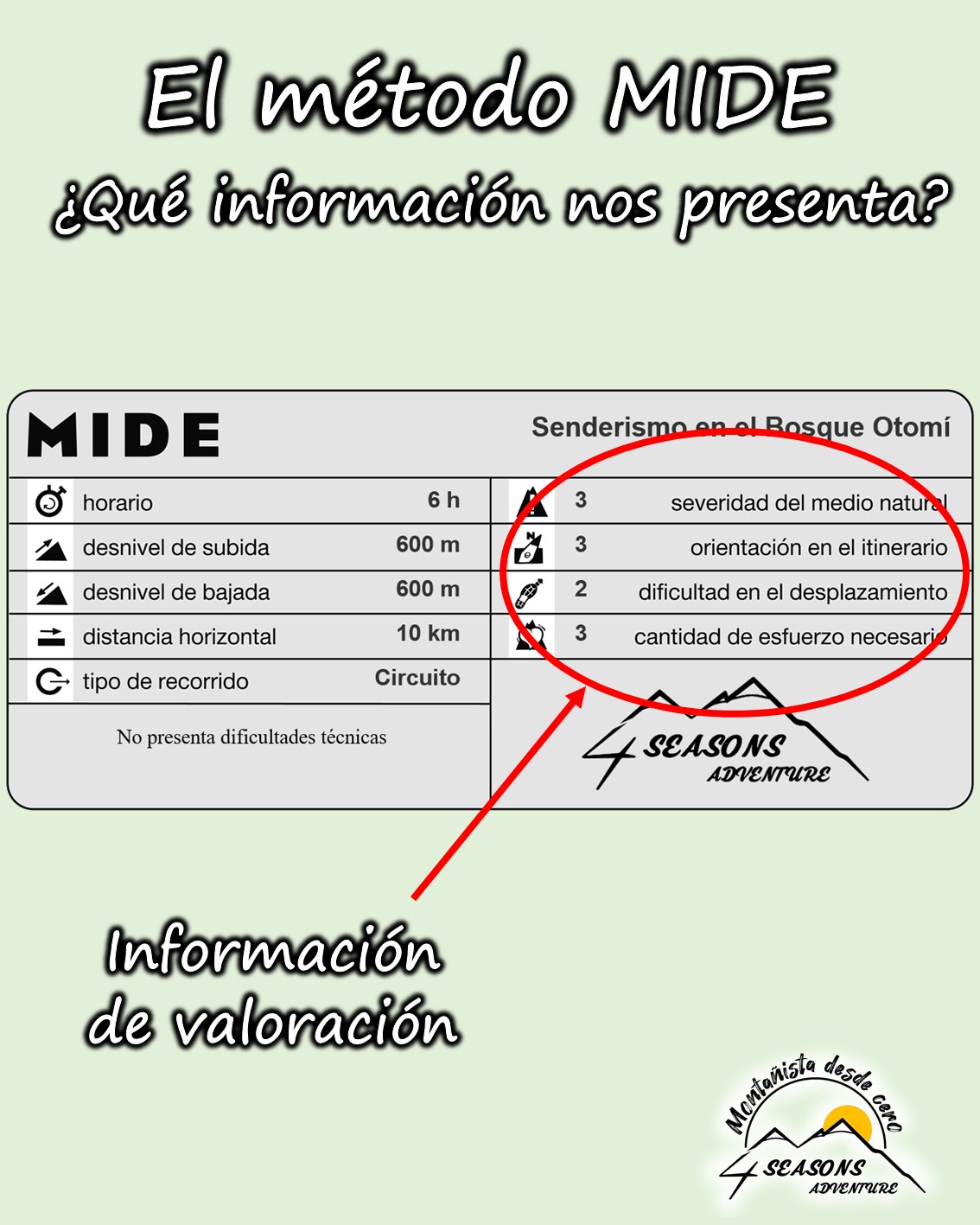 La INFORMACIÓN DE VALORACIÓN tiene escala de 5, nos muestra un resumen de lo complicado técnicamente que es la ruta.