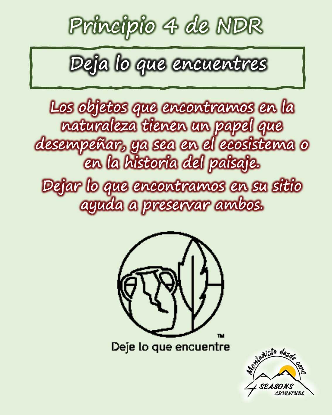 Debemos dejar lo que encontramos en su sitio. Esto permitirá que los demás descubran la naturaleza dejando rocas, plantas, artefactos arqueológicos y otros objetos de interés tal y como los encontramos.