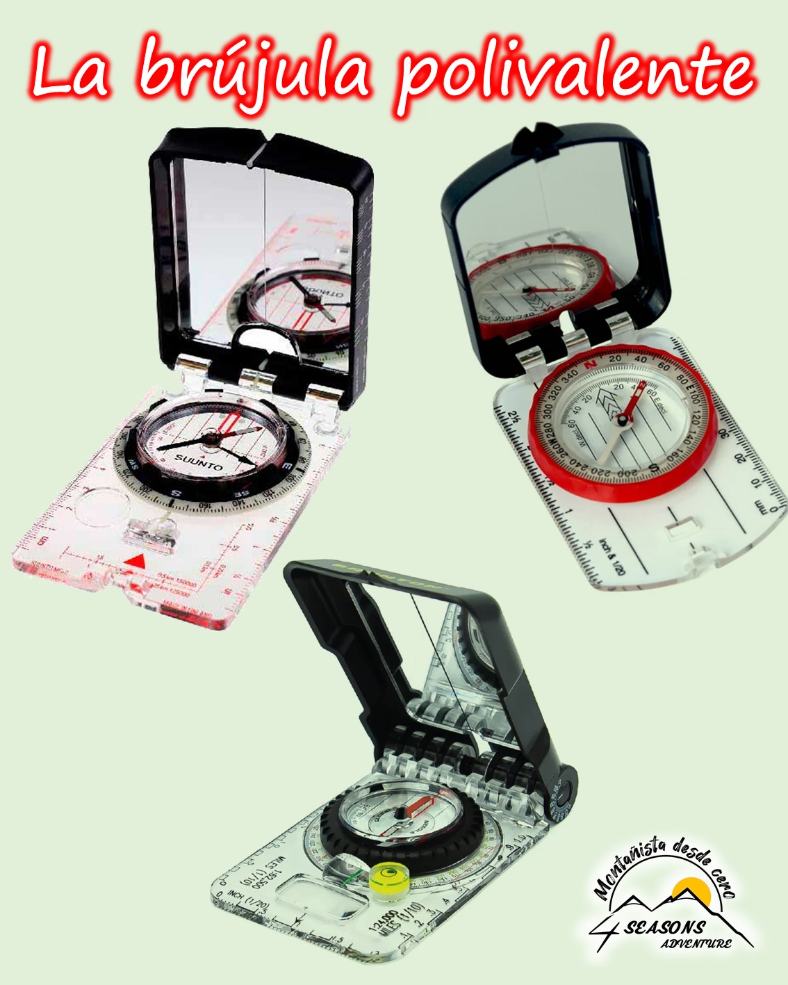 La brújula polivalente o de espejo es una variante de la brújula cartográfica que incorpora una característica clave para mejorar la precisión en la toma de rumbos. Es un tipo de brújula muy popular entre montañistas y excursionistas experimentados que necesitan una combinación de precisión en el terreno y funcionalidad con el mapa.