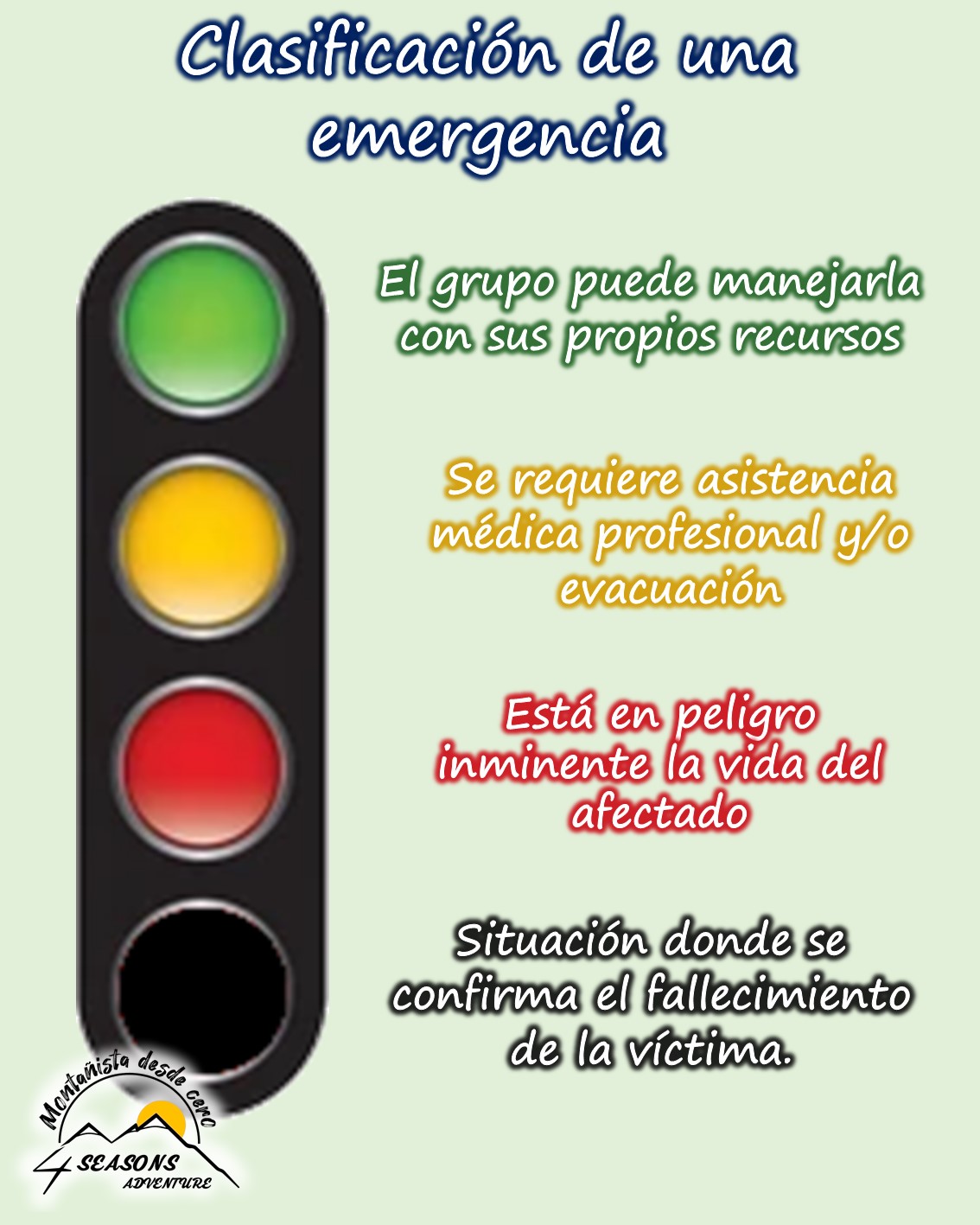 Una de las más utilizadas clasifica una emergencia en cuatro niveles, asignándoles un color, que va del verde al negro.