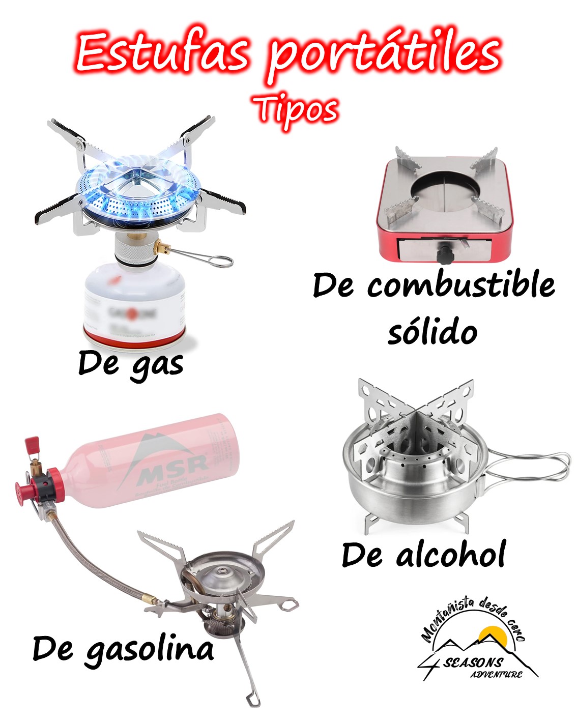 4. Las de alcohol. Son similares a las de combustible sólido. Una gran ventaja es que el alcohol se puede conseguir muy fácilmente. Son prácticas solo si requieres calentar algo pequeño