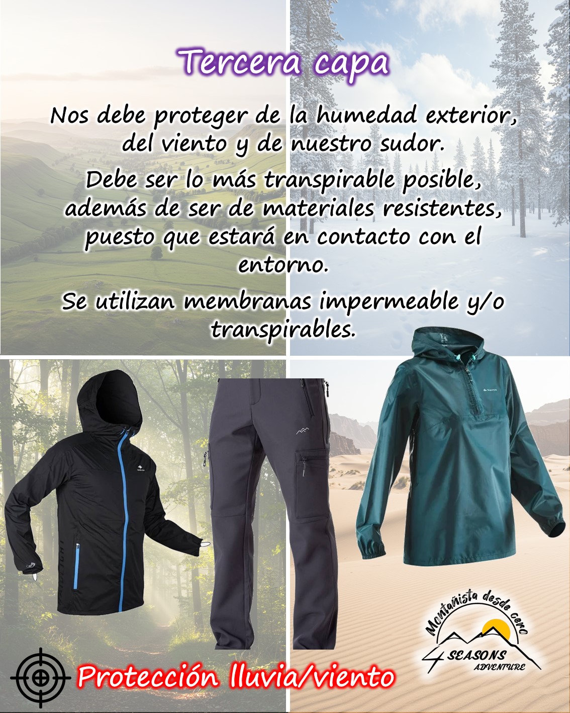Nos debe proteger de la humedad exterior, del viento y de nuestro sudor. Debe ser lo más transpirable posible, además de ser de materiales resistentes, puesto que estará en contacto con el entorno. Se utilizan membranas impermeable y/o transpirables.