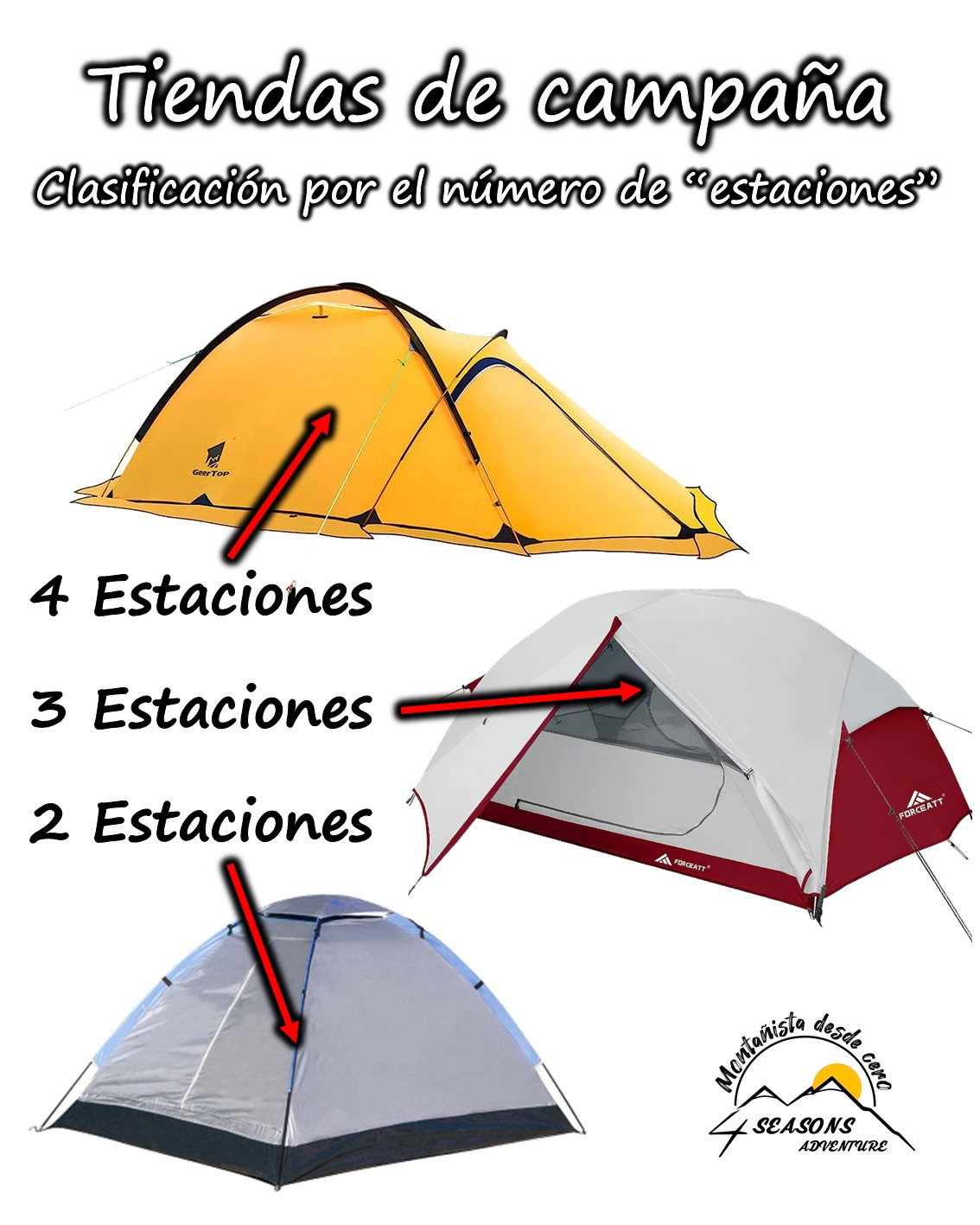 Las de 3 estaciones presentan más resistencia ante vientos o lluvias fuertes, sus varillas son de aluminio y tienen más elementos para anclarse al piso (llamados vientos o tensores). Son ideales para campamentos en bosque o media montaña.