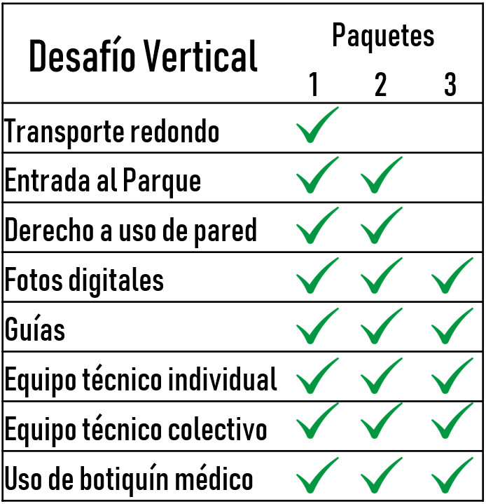 | No recomendado para | Personas con miedo a las alturas, con hipertensión, asma, vértigo, problemas de columna, rodillas, entre otros | |